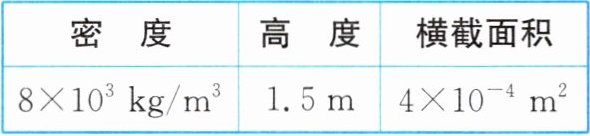 (1) 金属棒的体积 $ V = Sh = 4 × 10^{-4} \, \mathrm{m}^2 × 1.5 \, \mathrm{m} = 6 × 10^{-4} \, \mathrm{m}^3 $