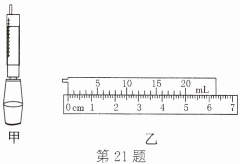 21. (2025·无锡滨湖期中)如图甲所示,小明用该装置估测大气压。将活塞推至注射器筒前端,用橡皮帽封住注射器的小孔,在活塞上拴挂一个小桶,然后向小桶中缓慢加水,直至活塞刚好被拉动。测得桶与水的总质量为4.4kg,已知注射器的容积为20mL、注射器有刻度部分的长度l如图乙所示,则l=