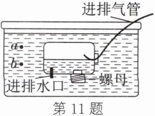 11. (2025·南通崇川校级一模)用硬塑料瓶、透明胶带、螺母、塑料管、容器和水等,制作如图所示的潜水艇模型,不计进排气管体积。要让原本悬浮在 $ b $ 位置的潜水艇上浮至 $ a $ 位置并悬浮,采取的措施是使瓶内气体(