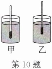10. (2025·无锡模拟)物理兴趣小组的同学制作了一个简易密度计,分别放入盛有不同液体的两个容器中,静止时液面相平如图所示,密度计在液体中受到的浮力 $ F_{甲} $_________$ F_{乙} $,液体对容器底的压强 $ p_{甲} $_________$ p_{乙} $。($ >/=/< $)