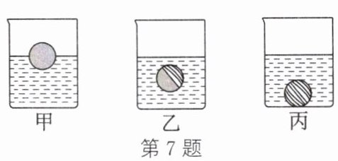 7. (2025·无锡锡山校级二模)小敏将橙子放入水中,静止后如图甲,将该橙子剥去部分表皮后放入水中,静止后如图乙,剥去全部表皮后放入水中,静止后如图丙(不考虑实验过程中橙子吸水)。下列说法正确的是(图中液面不一定代表实际液面位置)(