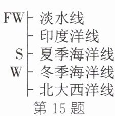 15. 为了航行安全,远洋轮的船体需标有国际航行载重线,即轮船满载时的“吃水线”。如图所示是某船满载时在不同水域、季节时的“吃水线”,该船在不同水域、季节航行时,水(海水)面正好与“吃水线”相平,当船从北大西洋驶向印度洋时(忽略燃料质量变化),下列分析正确的是(