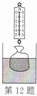 12. (2025·南京一模)如图所示,在一只轻薄透明塑料袋中装有大半袋水,用弹簧测力计吊住塑料袋并将其缓慢浸入水中,当测力计示数减小为零时(塑料袋不接触杯底),发现袋内外水面相平。为了说明浮力的大小与液体的密度有关,仅提供密度不同的两种液体甲和乙($ \rho_{甲}> \rho_{水}> \rho_{乙} $),在前面步骤的基础上,要求控制 $ V_{排} $ 不变,以下关于器材选用的设计方案正确的是(