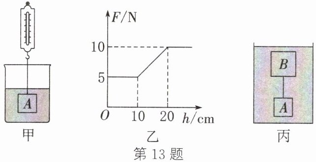 13. (2025·南京秦淮校级模拟)如图甲所示,悬挂在弹簧测力计下的实心圆柱体 $ A $ 浸没在水中,将其缓慢拉出水面(忽略物体带出的水),弹簧测力计的示数 $ F $ 与圆柱体 $ A $ 上升的高度 $ h $ 之间的变化图像如图乙所示。然后将体积为 $ 2000cm^{3} $ 的实心物体 $ B $ 用细线和 $ A $ 连接在一起,如图丙所示放入水中,$ A $、$ B $ 刚好悬浮。细线的重力和体积忽略不计,$ \rho_{水}=1×10^{3}kg/m^{3} $,$ g $ 取 $ 10N/kg $,下列说法正确的是(
