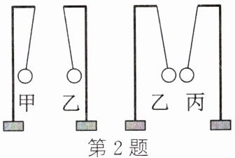2. 甲、乙、丙三个轻质小球用绝缘细线悬挂,相互作用情况如图所示。若丙带正电,则甲(