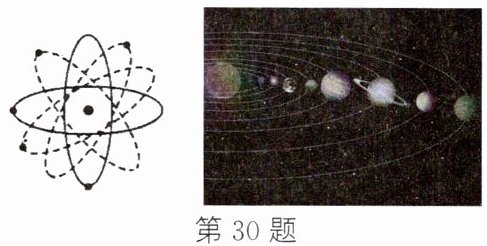 30. 如图所示分别为原子结构模型和太阳系,请写出两者之间相似和不同之处:
