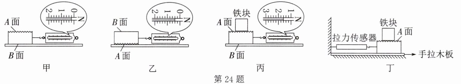 答案:24.(1)匀速直线 二力平衡 (2)在接触面粗糙程度相同时,压力越大,滑动摩擦力越大 A、B两个面对调 A (3)B