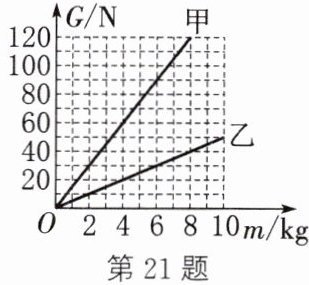 21. 小玄对太空中的星球比较感兴趣,他从网上查得:甲、乙两个星球表面上物体的重力G与其质量m的关系如图所示。小金的质量为50kg,他到乙星球上所受重力的大小为