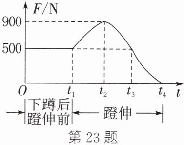 23. (2025·南京秦淮校级模拟)立定跳高可分解为下蹲、蹬伸和腾空三个过程。如图为某运动员下蹲后在蹬伸过程中所受地面支持力F随时间t变化的关系。据图可知,该运动员受到的重力为