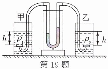 19. (2025·无锡新吴校级二模)为了研究液体内部压强的特点,小刚将两个完全相同的压强计进行了改进,当两探头置于空气中时,U形管液面相平,现将两探头分别放在甲、乙容器内密度分别为ρ₁和ρ₂的两种液体中,当两探头所处的深度相同时,U形管中的位置如图所示,左侧探头受到液体压强