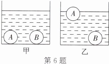6. (2025·扬州邗江一模)两个容器中分别盛有甲、乙两种不同的液体,把体积相同的 $ A $、$ B $ 两个实心小球放入甲液体中,两球沉底,如图甲所示;放入乙液体中,两球静止时的情况如图乙所示,两容器中液面刚好相平,则下列说法正确的是 (