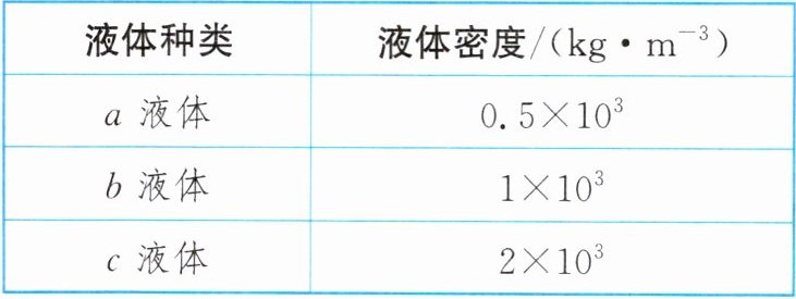 10. (2024·潍坊)物理兴趣小组把吸管的下端密闭并缠绕一段细铜丝(细铜丝体积忽略不计),自制一个简易密度计。如图所示,密度计分别放入 $ a $、$ b $、$ c $ 三种液体中时,均漂浮在液体中,且保持竖直姿态。密度计在三种液体中静止时,在密度计上与液面相齐处各标记一条刻线,共得到三条刻线。已知密度计在 $ c $ 液体中,有 $ \frac{1}{8} $ 的体积浸入液体,浸入体积为 $ 5 × 10^{-6} \mathrm{ m}^3 $,三种液体密度如表所示,下列分析正确的是 (