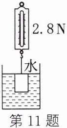 11. (2024·孝感孝南期末)探究浮力实验时,小青将重为 $ 6 \mathrm{ N} $ 的长方体铝块浸在水中,如图所示,铝块上表面刚好与水面相平,此时弹簧测力计示数为 $ 2.8 \mathrm{ N} $,长方体铝块下表面所受水的压力为 (