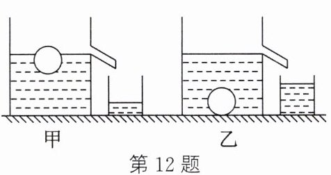 12. (2025·宿迁泗洪二模)如图所示,水平桌面上有两个相同的溢水杯甲、乙,分别装满不同的液体,将同一个小球分别放入两个溢水杯中静止时,从甲杯中溢出了 $ 0.6 \mathrm{ N} $ 的液体,从乙杯中溢出了 $ 0.4 \mathrm{ N} $ 的液体。下列说法正确的是 (