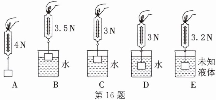 16. (2025·扬州模拟)某物理兴趣小组用如图所示的实验装置来探究“影响浮力大小的因素”,将金属块放入液体中,其中图 B、C、D 烧杯中是水,图 E 烧杯中是未知液体。($ \rho_{\mathrm{水}} = 1.0 × 10^{3} \mathrm{ kg/m}^3 $,$ g $ 取 $ 10 \mathrm{ N/kg} $)