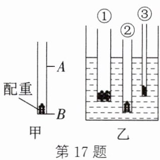 17. (2025·南通如东校级模拟)如图甲所示是小明用粗细均匀的吸管制成的简易密度计,竖直漂浮在水中时,水面位于图中 $ A $ 处,图中 $ A $、$ B $ 间距离为 $ 12 \mathrm{ cm} $,再将该密度计漂浮在密度为 $ 0.8 \mathrm{ g/cm}^3 $ 的消毒酒精中,此时所受的浮力