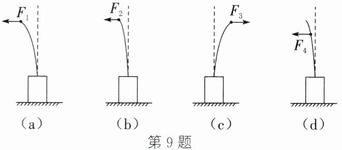 9. (2024·娄底娄星校级期中)如图所示,使一薄钢片的下端固定,分别用不同的力去推它,使其发生(a)(b)(c)(d)各图所示的形变,如果力的大小关系为$F_{1}=F_{3}=F_{4}>F_{2}$,那么,能说明力的作用效果跟力的方向有关的是 (