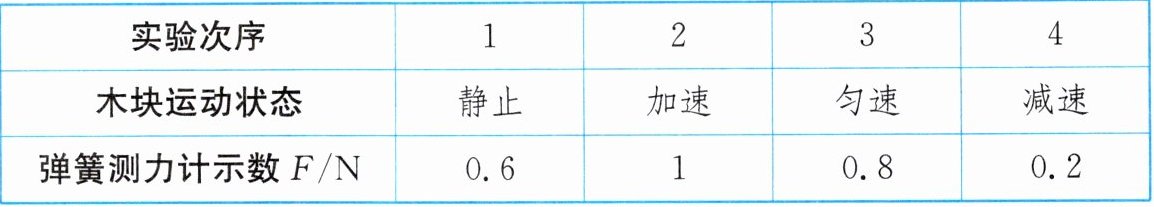 1. 某同学用如图所示的实验装置测量滑动摩擦力的大小,实验过程中,该同学将木块的运动状态和弹簧测力计的示数记录在表格中。第4次实验中,木块受到的摩擦力大小是(