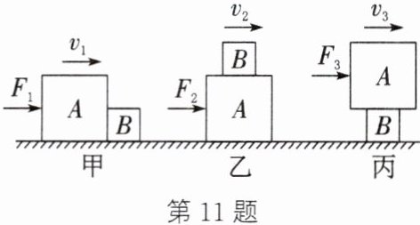 11. (2025·南京秦淮校级模拟)如图所示,A和B两个材料相同的硬质正方体分别以甲、乙、丙三种方式放置在相同的水平面上一起做匀速直线运动,其速度关系是v₁ < v₂ < v₃,则乙、丙中推力关系是F₂