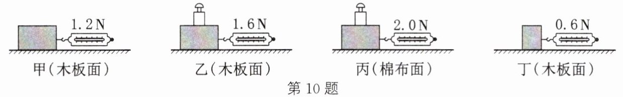 10. 在“探究影响滑动摩擦力大小因素”的实验中,实验装置如图。选取三个相同的木块分别放在不同的接触面上,其中甲、乙两图的接触面是相同的木板,图丙的接触面是棉布。