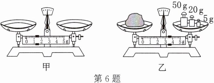 6. 小明使用天平测小石块的质量。测量前,他将天平放在水平桌面上,然后进行天平横梁平衡的调节,调节完成后指针静止时的位置和游码的位置如图甲所示。