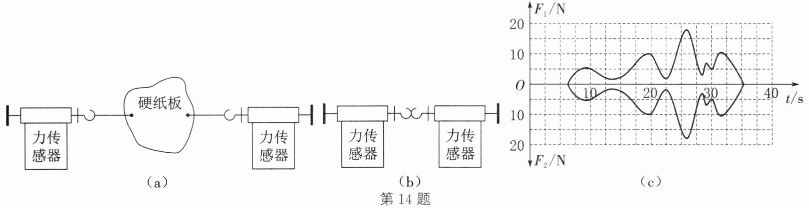14. (2025·无锡期中)某小组同学研究两个物体间相互作用力$ F_{1} $和$ F_{2} $的特点。现有器材:力传感器(相当于弹簧测力计)、数据采集器(可将传感器测得数据采集后输送至计算机)、计算机、硬纸板、细绳等。图(a)(b)为他们设计的两种实验方案。