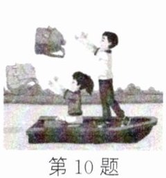 10. (教材 P43 材料改编)如图所示为小星梦见她和小海被困在一个结冰池塘中的情形,他们坐的小船停在光滑的冰面上,他们想出一个奇妙的方法——把行李向后扔出去而使船前行,“后扔”“前行”说明了