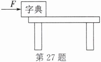 27. (2025·无锡梁溪校级段考)如图所示,字典的一部分悬空在水平桌面以外。小明发现后用水平向右的力 F 将字典推回桌面,在他推着字典运动的过程中,字典与桌面的摩擦力