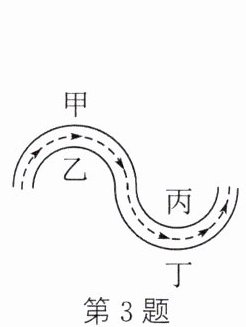 3. 小宇在家观看汽车拉力赛的电视节目,发现汽车行驶速度很快。其中汽车途经一段如图所示的“S”形弯道时,他想:现场观看的观众为了更安全,应站的位置是图中的(