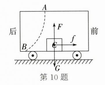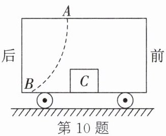 10. (2025·无锡梁溪校级期中)如图,汽车沿平直公路向前行驶。车顶 $ A $ 处滴落的水滴最终落在靠后的 $ B $ 处。车厢地板上的木箱 $ C $ 始终相对车厢静止。画出木箱 $ C $ 的受力示意图。