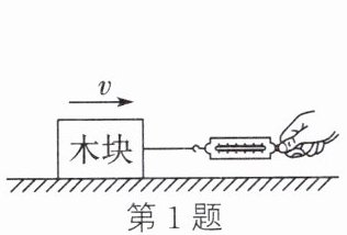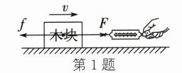1. 将木块放置于水平面上,在拉力 $ F $ 的作用下,木块在粗糙的水平面上向右匀速运动,请在图中画出木块在水平方向的受力示意图。