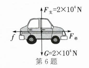 已知重力$G=2× 10^{4}\space \mathrm{N}$,方向竖直向下,所以支持力$F_{\mathrm{支}}=G=2× 10^{4}\space \mathrm{N}$,方向竖直向上;设动力为$F_{\mathrm{动}}$,摩擦力为$f$,则$F_{\mathrm{动}}=f$,方向分别为水平向前和水平向后。