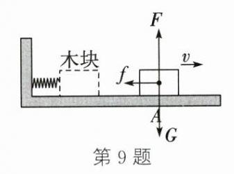 9. (2024·南京一模)如图所示,水平面上的木块被弹簧弹离后,经过 $ A $ 位置继续向右运动最后停下。请画出木块在 $ A $ 位置时受力的示意图。