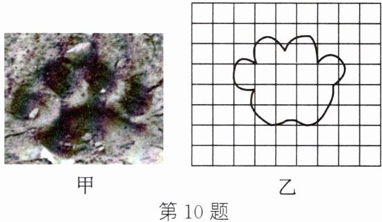 答案:10. (1)根据图乙可数出共有15小格,则图中脚印面积大约为$S_{0}=15×9 cm^{2}=135 cm^{2} (2)$容器下陷的深度与脚印的深度相同时,说明两者产生的压强相同,则有$p_{1}=p_{2},$根据压强公式可得$\frac{G_{物}}{S_{物}}=\frac{G_{虎}}{S_{虎}},$所以$G_{虎}=\frac{G_{物}S_{虎}}{S_{物}},m_{虎}g=\frac{m_{物}g×4×135×10^{-4} m^{2}}{100×10^{-4} m^{2}},m_{虎}=\frac{30 kg×4×135×10^{-4} m^{2}}{100×10^{-4} m^{2}}=162 kg$