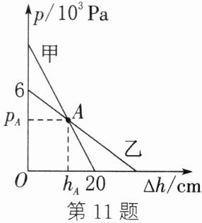 11. 质量分布均匀的实心正方体甲、乙放在水平地面上,将甲、乙沿水平方向切去高度$\Delta h$,剩余部分对地面的压强$p$与$\Delta h$的关系如图所示,已知$ρ_{甲}=6×10^{3}$kg/$m^{3}$,乙的棱长为30cm,下列选项正确的是($g$取10N/kg)(