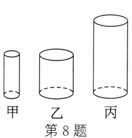 8. 如图所示,有三个实心圆柱体甲、乙、丙放在水平地面上,其中甲、乙高度相同,乙、丙的底面积相同,三者对地面的压强相等,下列判断正确的是(