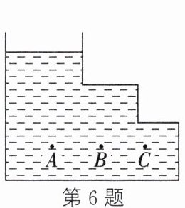 6. 如图所示,盛水容器置于水平桌面上,则$A$、$B$、$C$三点处的压强大小关系:$p_{A}$_________$p_{B}$,$p_{B}$_________$p_{C}$。($>$/$=$/$<$)