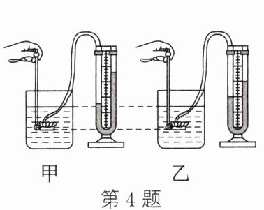 4. (2024·南京模拟)用如图器材探究液体压强与什么因素有关,将压强计的金属盒分别放入体积相同的甲、乙两种液体中,下列说法中正确的是(