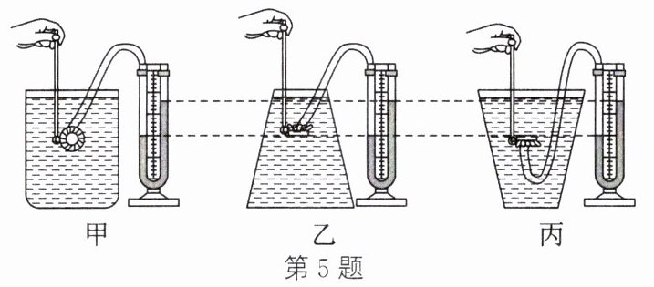 5. 如图所示,将同一支压强计的金属盒依次放入装有同种液体的甲、乙、丙容器中,金属盒面的朝向不同,但$U$形管液面的高度差相等,要观察到这样的实验现象,需要控制的实验条件是(