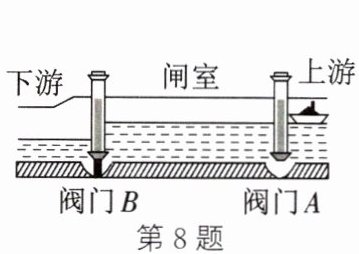 8. (2024·宝鸡金台期末)三峡船闸是世界上最大的人造连通器,如图是轮船通过船闸的示意图,此时上游阀门 A 打开,下游阀门 B 关闭。下列说法正确的是 (