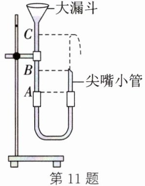11. 在一段长 50 cm 左右的胶皮管一端接一个顶端开口的尖嘴小管,另一端接一个大漏斗,这样便做成了一个人工喷泉(两连接处都密封好),如图所示。当往大漏斗灌水超过