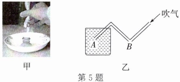 (2) 如图乙所示,将瓶口剪掉,瓶内装满水,将弯折吸管的A端插入水中,用另一根吸管沿图示方向吹气,B端就会有水持续流出,原因是吹气时B端空气流速变大,压强变