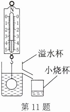 答案:11. (1)把小球浸没在装满水的溢水杯中$,V_{排}=V=1×10^{-4}m^{3},$小球受到的浮力$F_{浮}=\rho_{水}gV_{排}=1×10^{3}kg/m^{3}×10N/kg×1×10^{-4}m^{3}=1N (2)$小球的重力$G=F_{浮}+F_{拉}=1N+3.6N=4.6N (3)$小球的质量$m=\frac{G}{g}=\frac{4.6N}{10N/kg}=0.46kg,$小球的密度$\rho_{小球}=\frac{m}{V}=\frac{0.46kg}{1×10^{-4}m^{3}}=4.6×10^{3}kg/m^{3}$