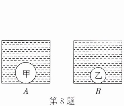 8. 两个完全相同的容器 $A$、$B$ 中分别装满了两种不同的液体,把甲、乙两球分别轻轻放入两液体中,静止后的情况如图所示,已知甲、乙两球排开液体的重力相等,则下列说法正确的是(