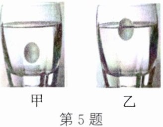 5. 甲、乙两个完全相同的杯子盛有不同浓度的盐水,将同一只鸡蛋先后放入其中,当鸡蛋静止时,两杯中液面相平,鸡蛋所处的位置如图所示,则下列说法正确的是(