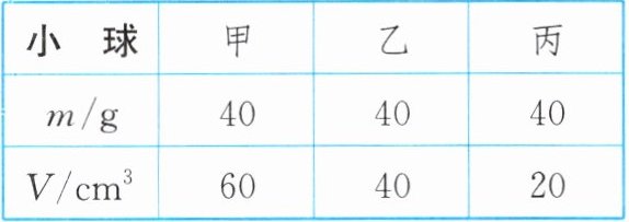 1. 计算各小球密度:$\rho_{\mathrm{甲}}=\frac{m_{\mathrm{甲}}}{V_{\mathrm{甲}}}=\frac{150\ \mathrm{g}}{50\ \mathrm{cm}^3}=3\ \mathrm{g/cm}^3$,$\rho_{\mathrm{乙}}=\frac{m_{\mathrm{乙}}}{V_{\mathrm{乙}}}=\frac{50\ \mathrm{g}}{50\ \mathrm{cm}^3}=1\ \mathrm{g/cm}^3$,$\rho_{\mathrm{丙}}=\frac{m_{\mathrm{丙}}}{V_{\mathrm{丙}}}=\frac{40\ \mathrm{g}}{50\ \mathrm{cm}^3}=0.8\ \mathrm{g/cm}^3$。