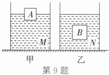 9. 水平桌面上放有完全相同的甲、乙两烧杯,烧杯内分别盛有$ M $、$ N $两种液体,将质量相等、体积不等($ V_A < V_B $)的正方体实心物块$ A $、$ B $分别放入两烧杯中,静止时液面刚好相平,如图所示。下列判断错误的是(