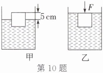 答案:10.(1)正方体物块的棱长$a = 10\mathrm{ cm}=0.1\mathrm{ m}$,露出水面的高度$h = 5\mathrm{ cm}=0.05\mathrm{ m}$,物块受到水的浮力$F_{浮}=\rho_{水}gV_{排}=\rho_{水}gSh = 1.0×10^{3}\mathrm{ kg/m}^3×10\mathrm{ N/kg}×(0.1\mathrm{ m})^{2}×(0.1\mathrm{ m}-0.05\mathrm{ m}) = 5\mathrm{ N}$