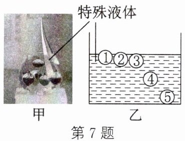 7. (2025·南京鼓楼校级模拟)图甲为一彩球“温度计”,其密闭玻璃容器内装有一种特殊液体,随着温度升高,这种液体的密度会减小。液体中有5个挂有温度标牌的彩球,彩球体积(包括标牌)相等,其热胀冷缩可以忽略。当有彩球悬浮时,悬浮的彩球标牌上的温度值就是所测得的当前环境温度。图乙为这个温度计的示意图,编号为4的彩球标牌所标温度值为22℃,相邻编号的彩球标牌上的温度值间隔为2℃,下列说法正确的是(