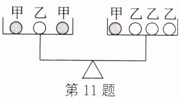11. (2024·盐城大丰期中)如图所示,由不同物质制成的甲、乙两种实心球的体积相等,此时天平平衡。则制成甲、乙两种球的物质密度之比为(